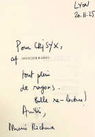 Le 20/11/2025, toujours à l'Œil, je me prémunis auprès de la radieuse Marie Richeux (descendue de Paris pour échanger autour de son Officier radio) : "Mon pseudo actuel, c'est Crisyx, sans H, je me déchristianise". Ayant déjà lu son livre (ce qui n'est pas le cas de toutes les personnes demandant une dédicace), et que je n'exclus pas de le relire, elle me souhaite une bonne re-lecture. Je réalise que, friand d'orthographe, j'ai manqué ma vocation : relecteur.